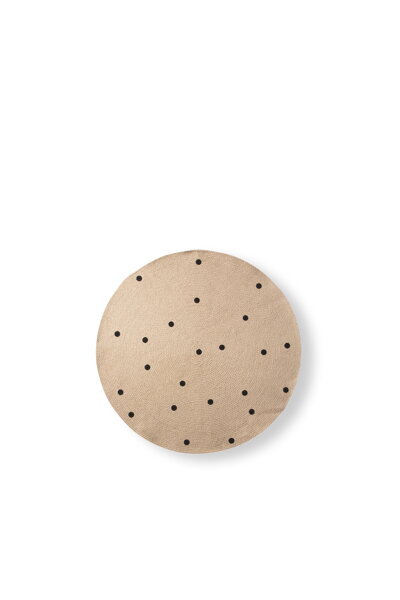 Malý okrúhly koberec do detskej izby Dots z prírodnej juty s čiernymi bodkami od dánskej značky Ferm Living.