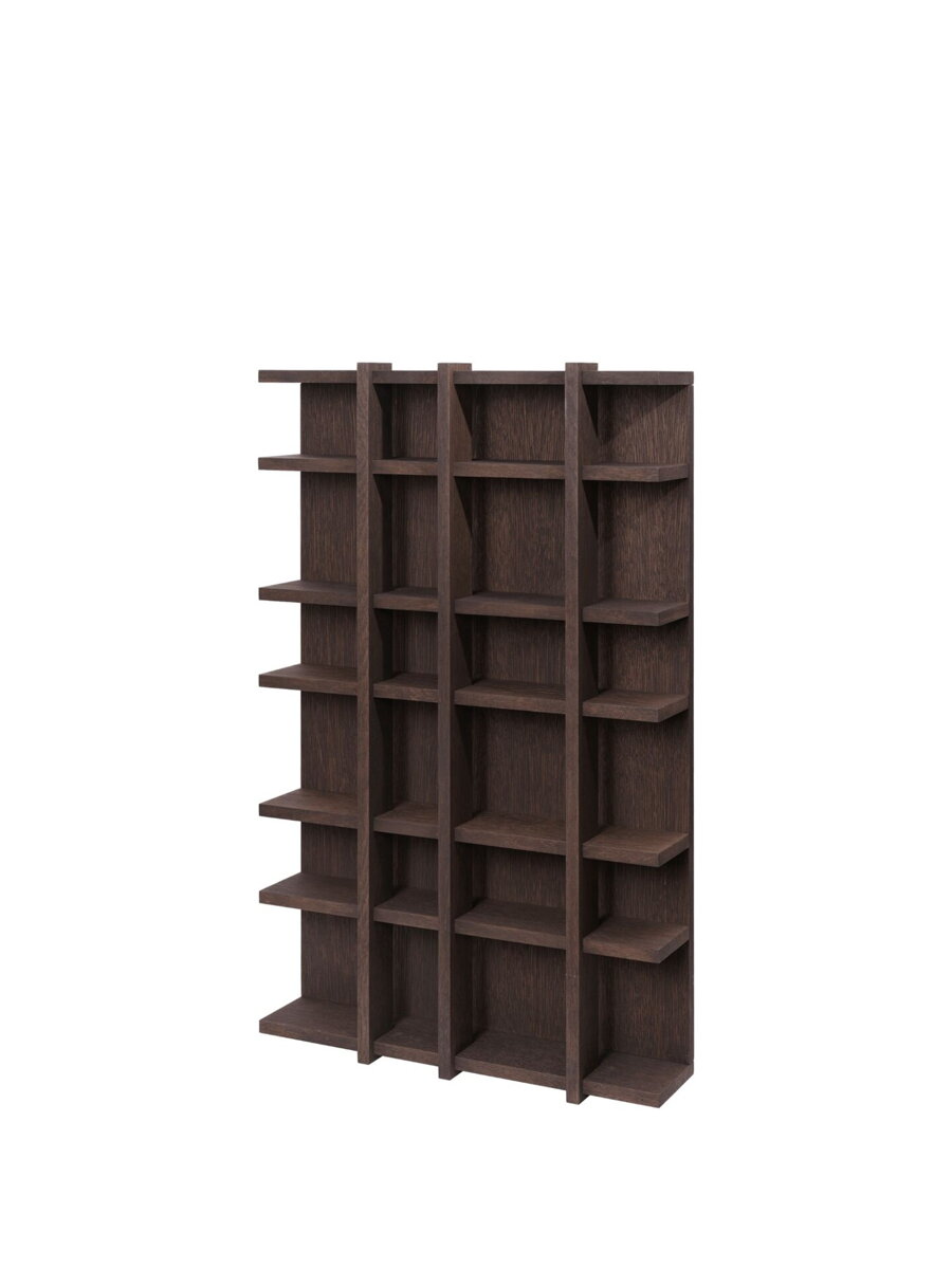 Výnimočnosť police Tilem spočíva v jej prepracovanej architektúre, kde asymetricky rozmiestnené priehradky rôznych veľkostí prirodzene pojmú predmety rozmanitých tvarov a výšok. Unikátnym detailom je subtílna medzera medzi vertikálnymi priečkami a zadným panelom, ktorá plní estetickú aj praktickú funkciu. Tento premyslený odstup umožňuje svetlu jemne prenikať cez celú štruktúru, čím expozícii dodáva ľahkosť a hĺbku, a zároveň poskytuje potrebný priestor pre ušká šálok alebo čajníkov, ktoré by na bežných policiach narážali do steny. Či už policu umiestnite do kuchyne na váš obľúbený porcelán, alebo do obývacej izby na vzácne drobnosti, Tilem vďaka svojmu čistému dánskemu minimalizmu premení každú prázdnu stenu na inšpiratívne miesto plné spomieniek.